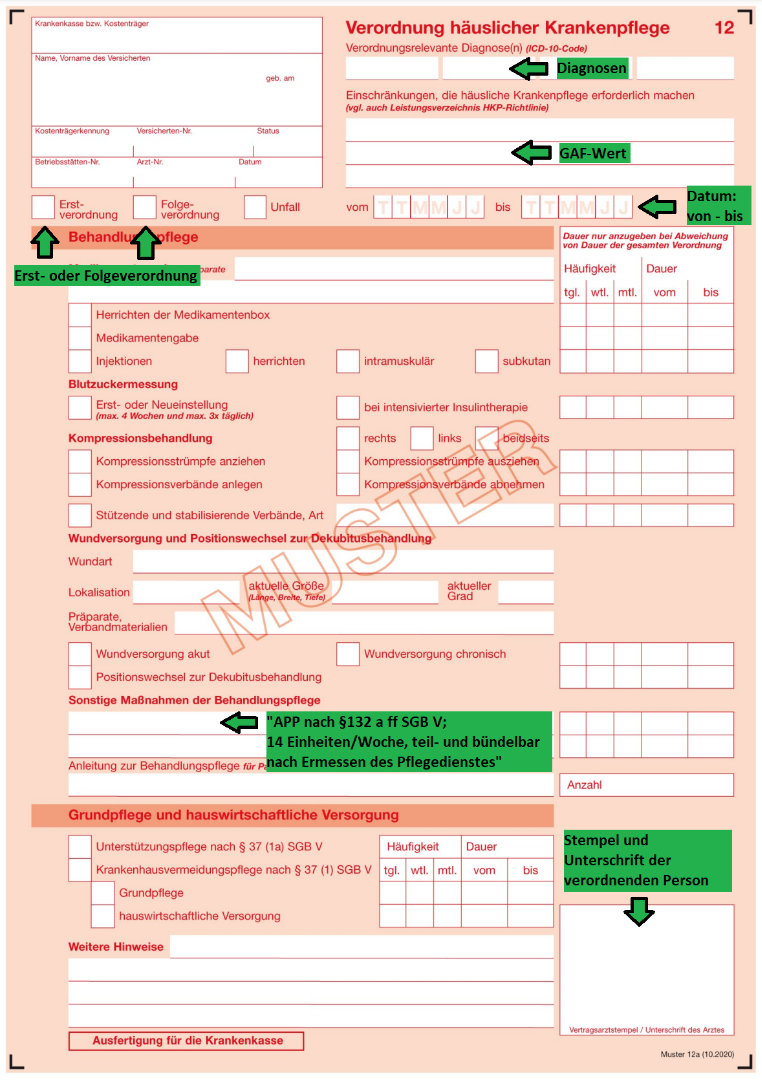 Im Verordnungsvordruck müssen folgende markierte Bereiche ausgefüllt werden (Quelle: https://www.kbv.de/media/sp/Muster_12_2020.pdf, mit eigener Editierung), wobei die Rückseite des Musters 12 vom Pflegedienst ausgefüllt und vom Versicherten unterschrieben wird. Der Pflegedienst hat die ordnungsgemäß ausgefüllte Verordnung spätestens am dritten der Ausstellung folgenden Arbeitstag der Krankenkasse vorzulegen.